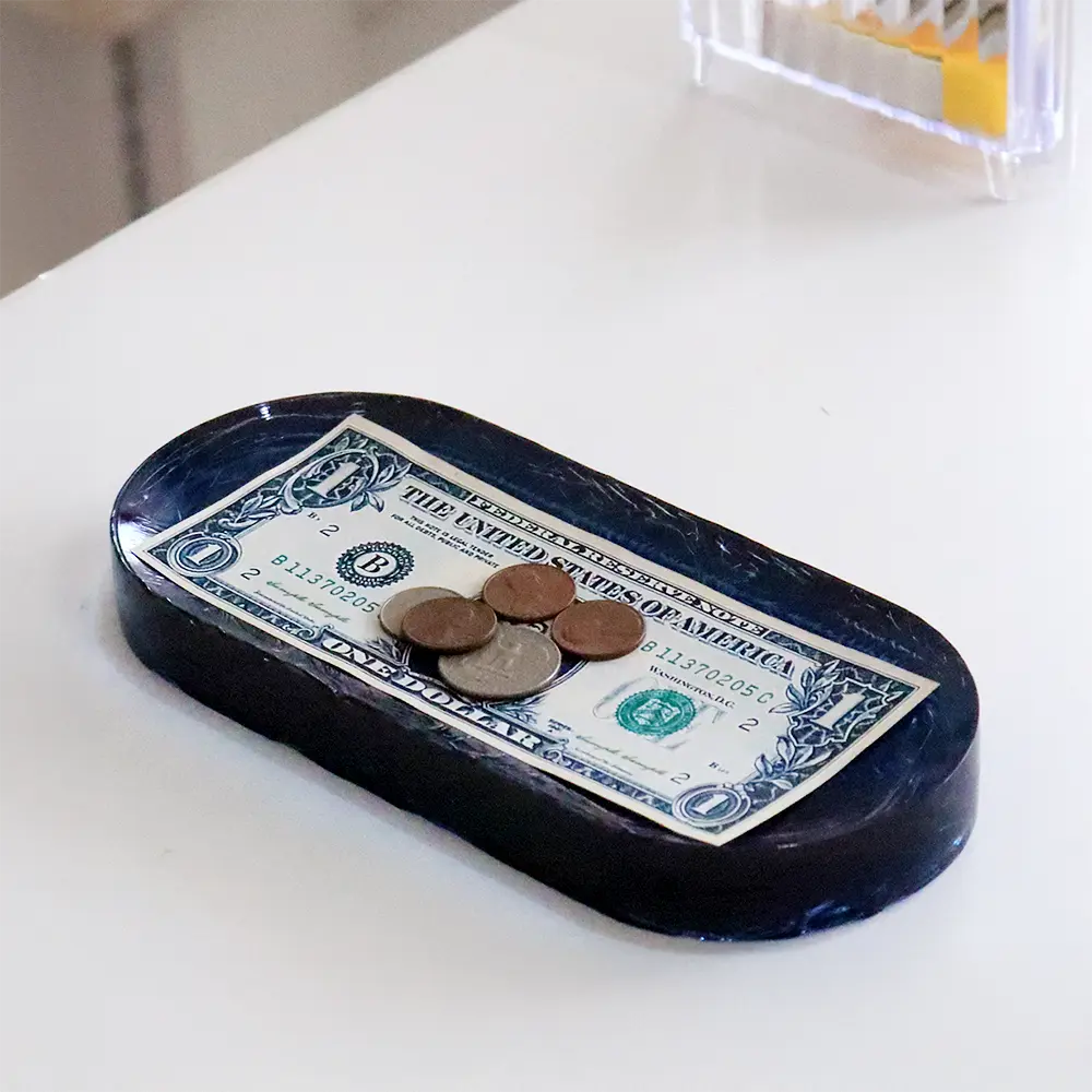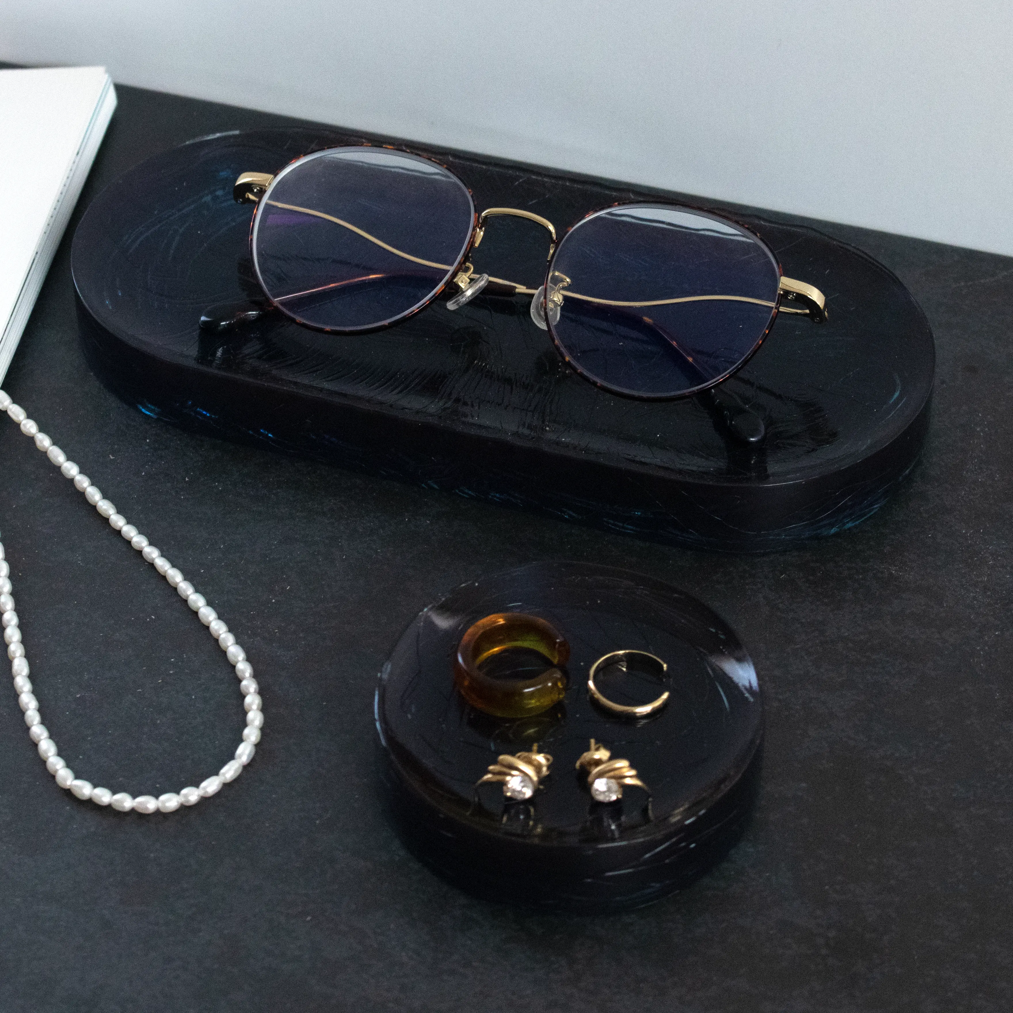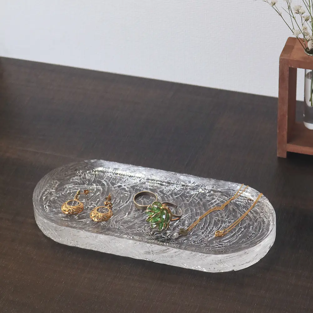 自動車のヘッドランプカバーなど透明成形のOEM製造を長年手掛けてきたことから、その技術を活用したものづくりの過程で生まれたマルチトレーのシリーズ。トレー中央にかけて緩やかなくぼみがあり、リングやアクセサリーなどの小物置きなどにおすすめです。